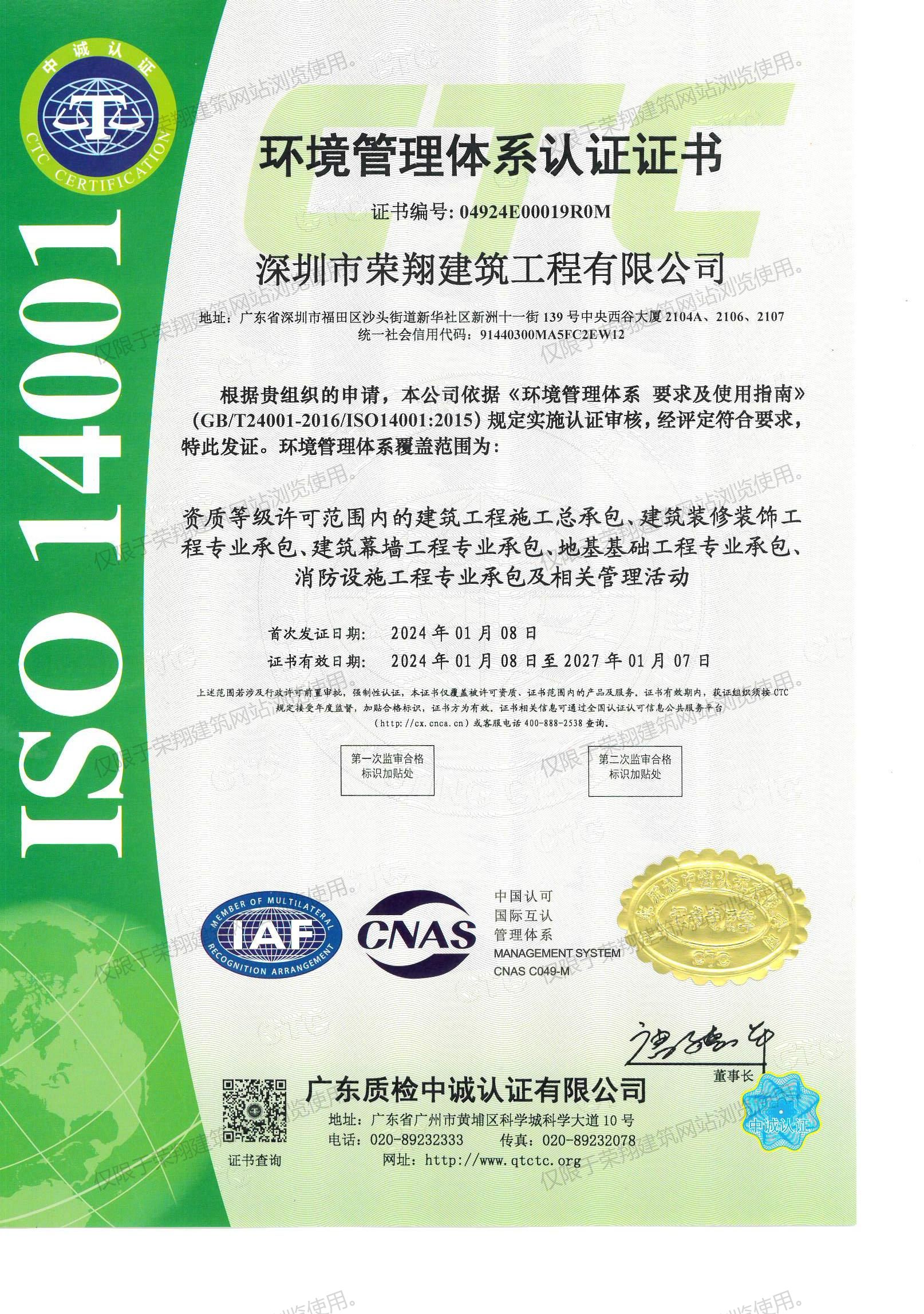 环境管理体系认证证书