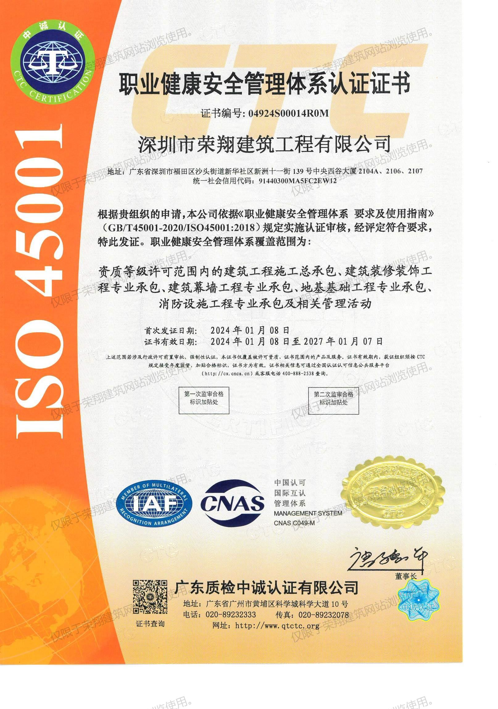 职业健康安全管理体系认证证书