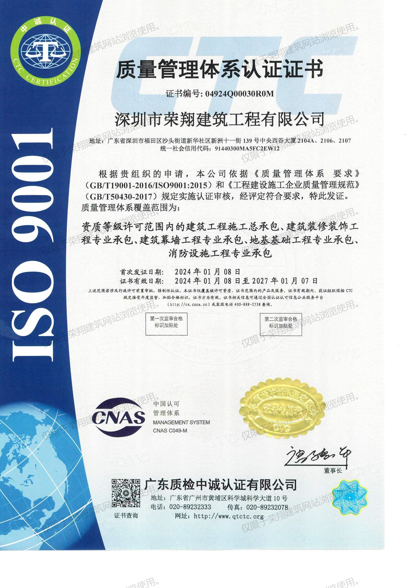 质量管理体系认证证书